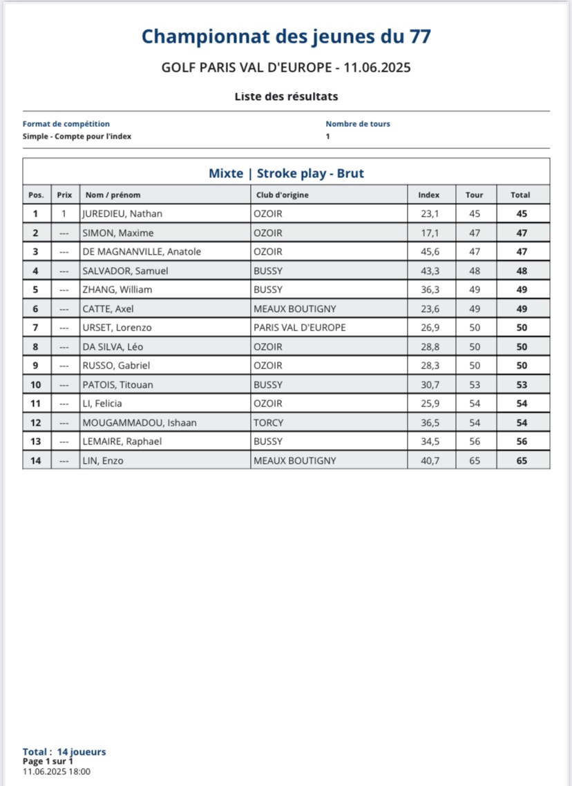 Merci à l’accueil et à la direction du Golf Paris Val d’Europe pour nous avoir permis d’organiser cette compétition